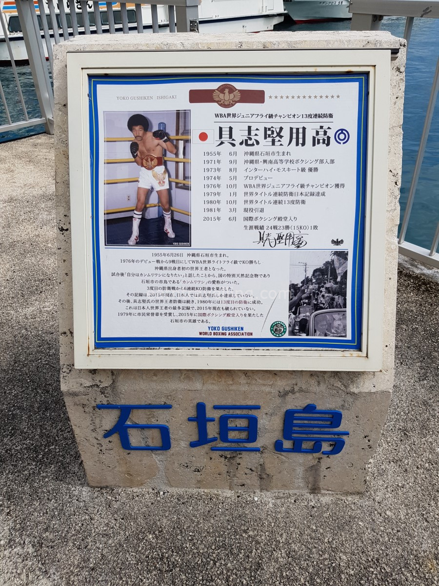 At the Ishigaki Ferry Terminal jetty area, there’s a monument of Yoko Gushiken, famous son of Ishigaki. I’ve seen him on a number of Japanese variety shows and didn’t know he was a boxer until I saw his monument in Ishigaki. If you like to know more about Gushiken-san, here’s the link to his wiki page.