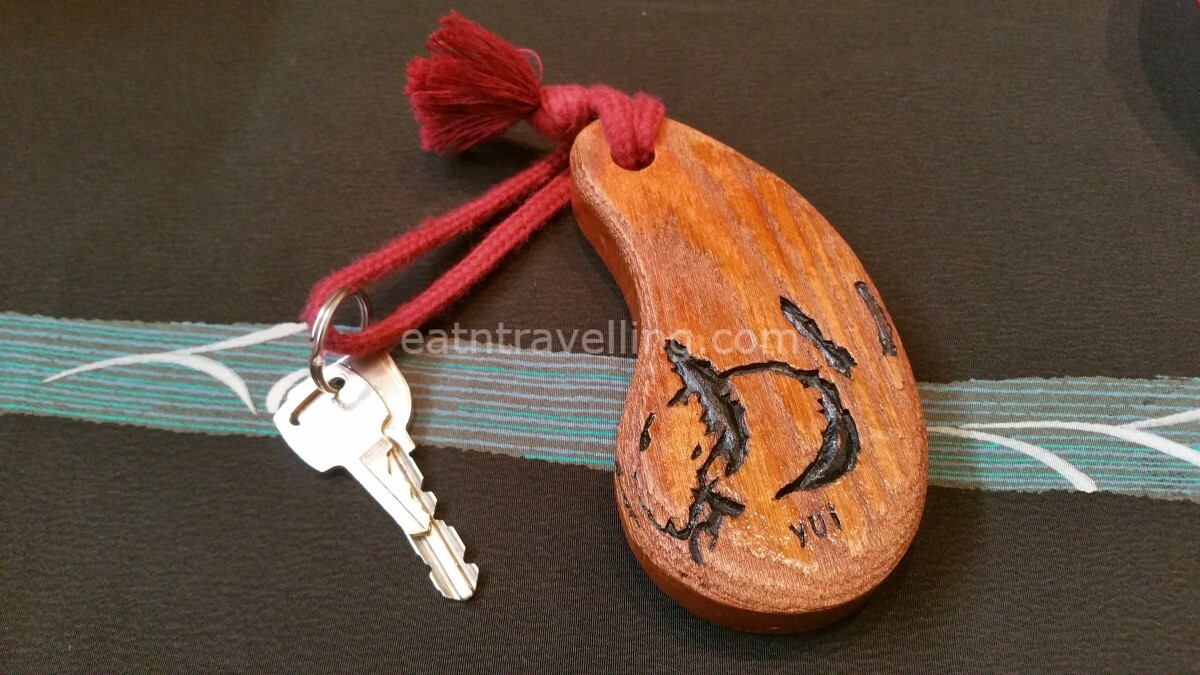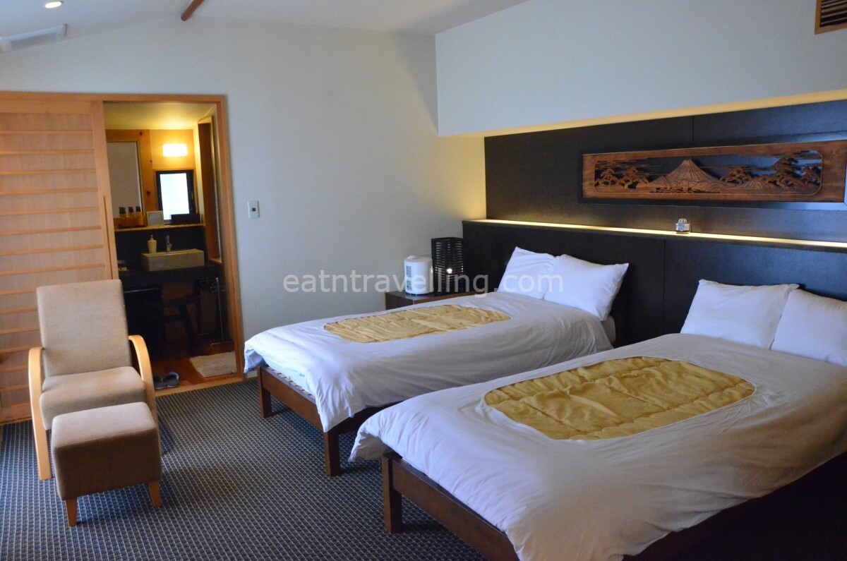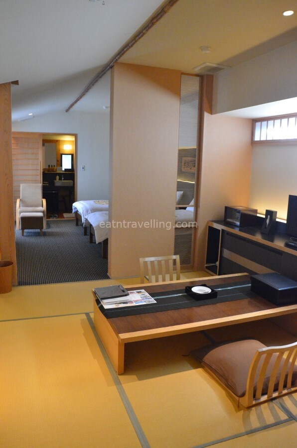 I had booked one of the larger rooms at Taizanso Ryokan – Western style twin beds with a tatami area where more futons could be placed for a larger group of guests. SY and I really liked the spacious room and the layout. The room was simply decorated, giving off a relaxing Zen feel; even the room key was unique.