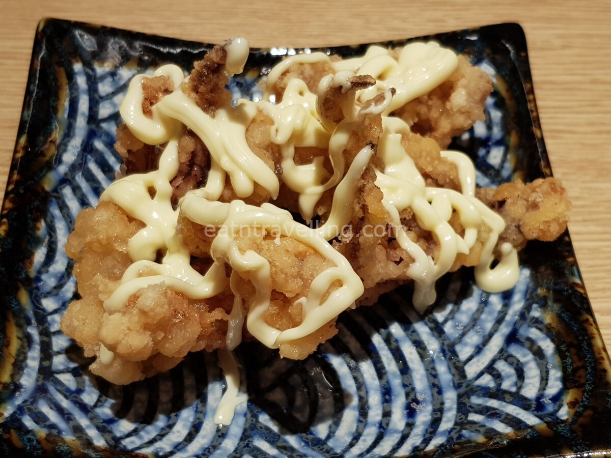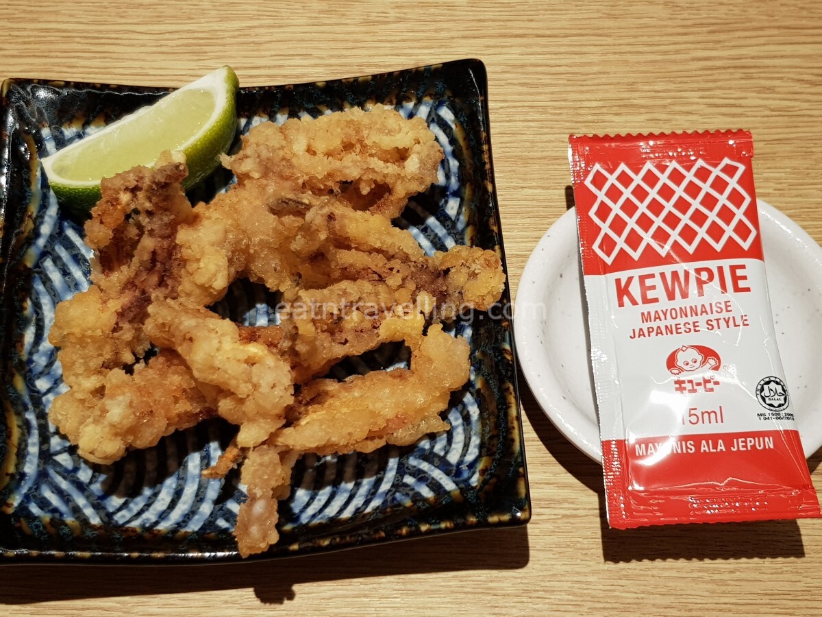 The Ikageso was served to our table by the little robot. It came with a slice of lime (I’m wondering if it was Sudachi or just plain lime) and a pack of Kewpie Mayonnaise.