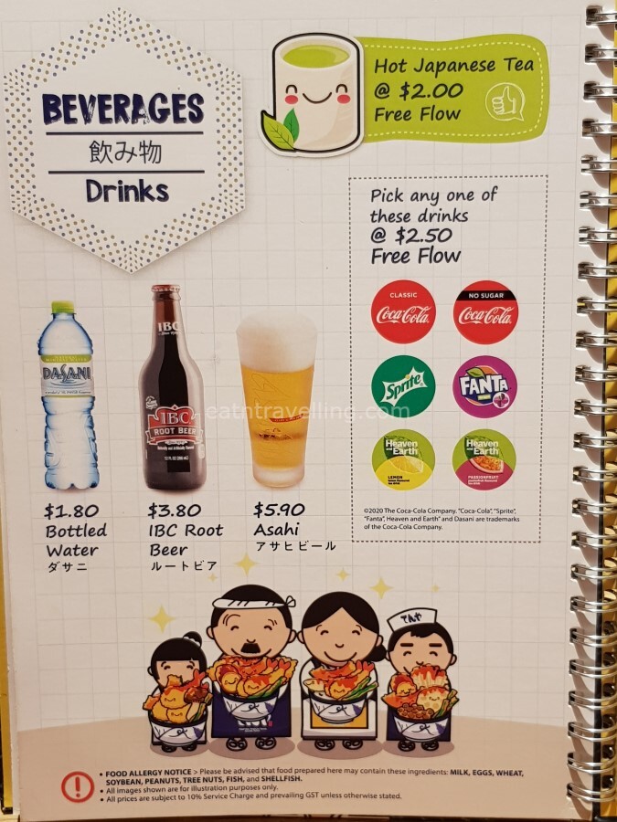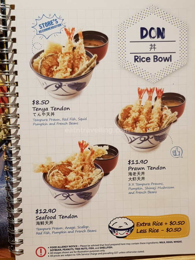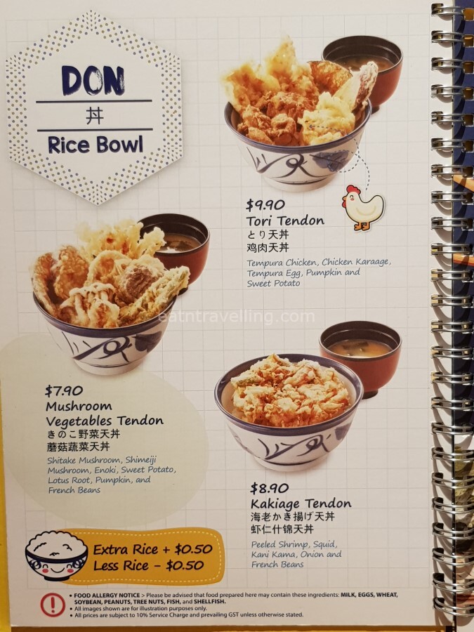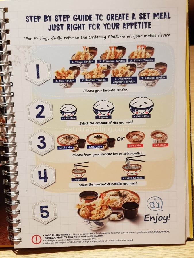 Below are Tenya’s menu pages. I was happily surprised to see they offered soba, udon, several other side dishes, desserts and drinks. We could even create our own set by adding soba/udon to our Tendon. According to one of the service staff, it would cost another S$4.00 to add on a Soba/Udon to a Tendon. There was also options to have less or more rice and they would minus or add S$0.50 for that change.