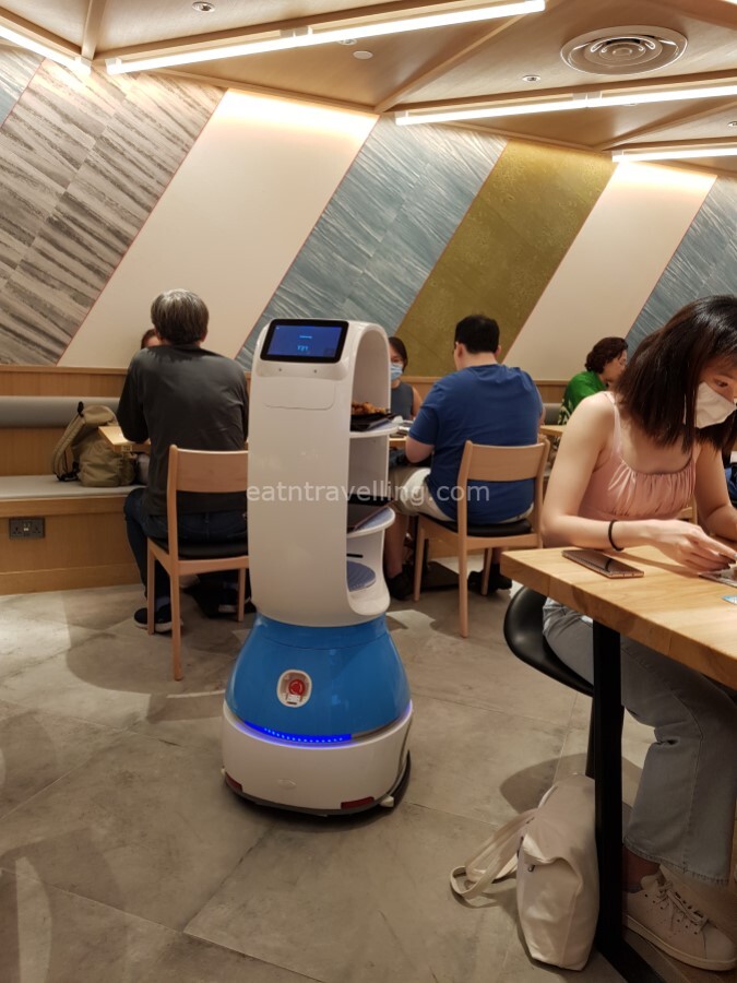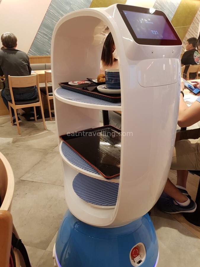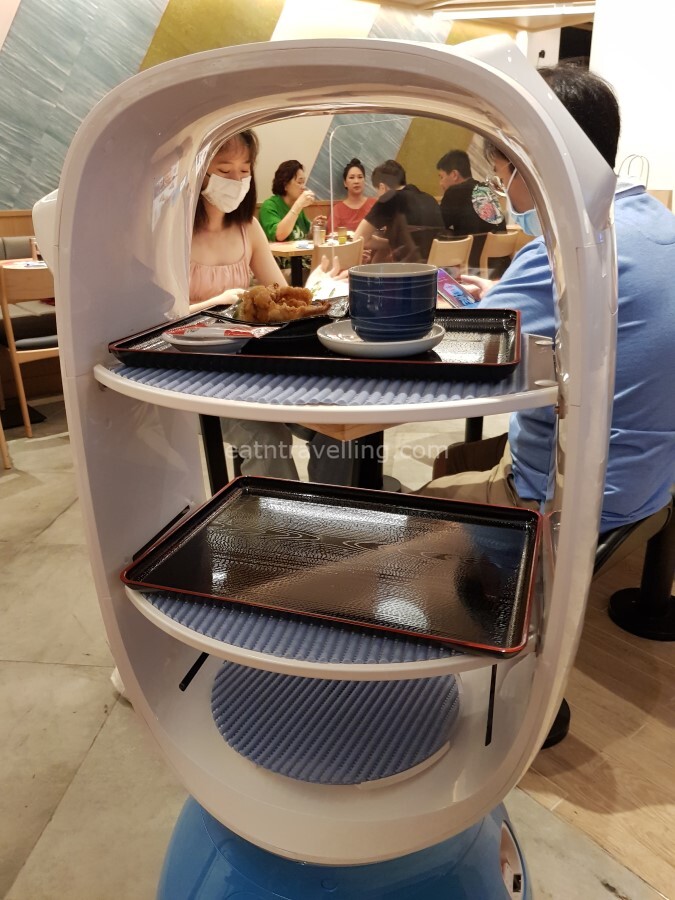 The robot is programmed to navigate its way to your table. Once it reached your table, it would say something (we couldn’t catch what it said) to announce the arrival of the food. The customer had to retrieve the items from the tray and after that press the OK button on the screen. The robot would then know its job was done and return to its station.