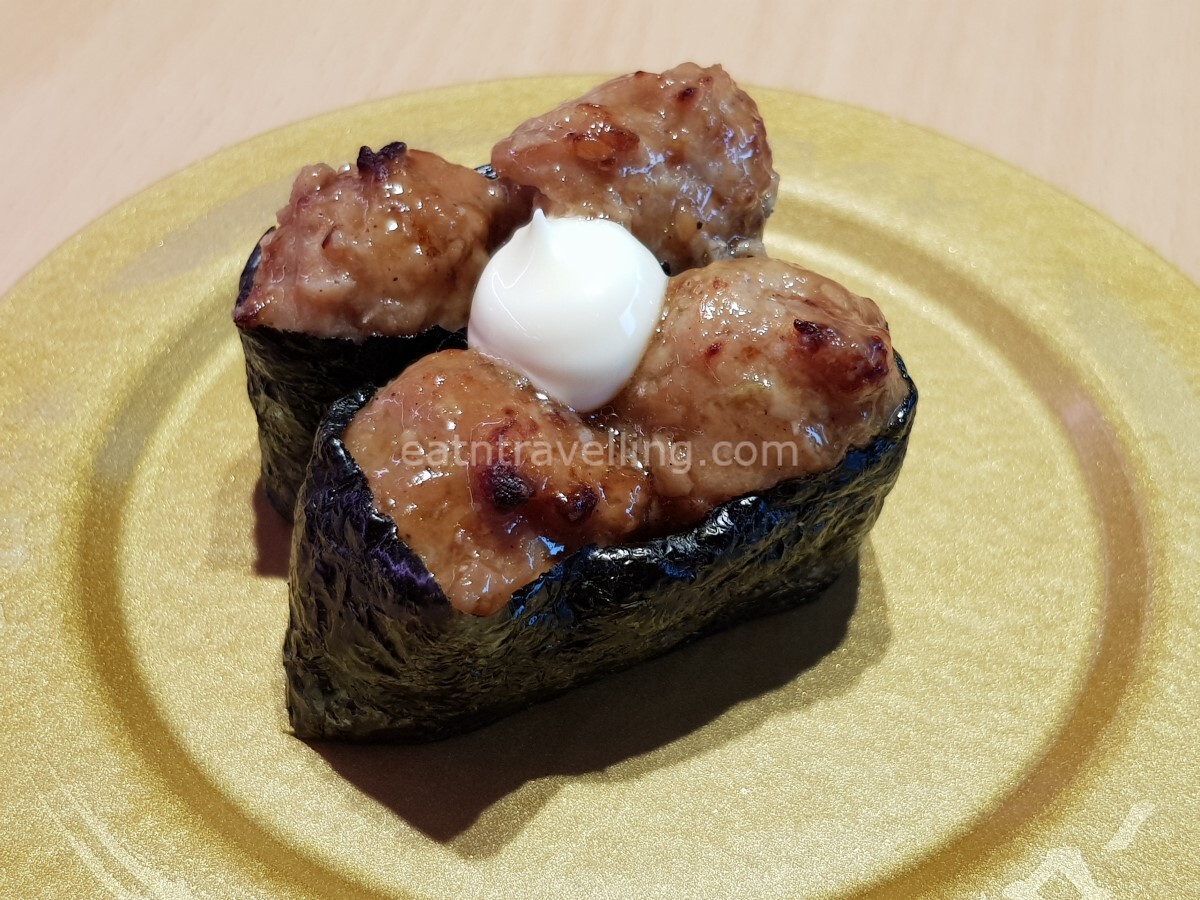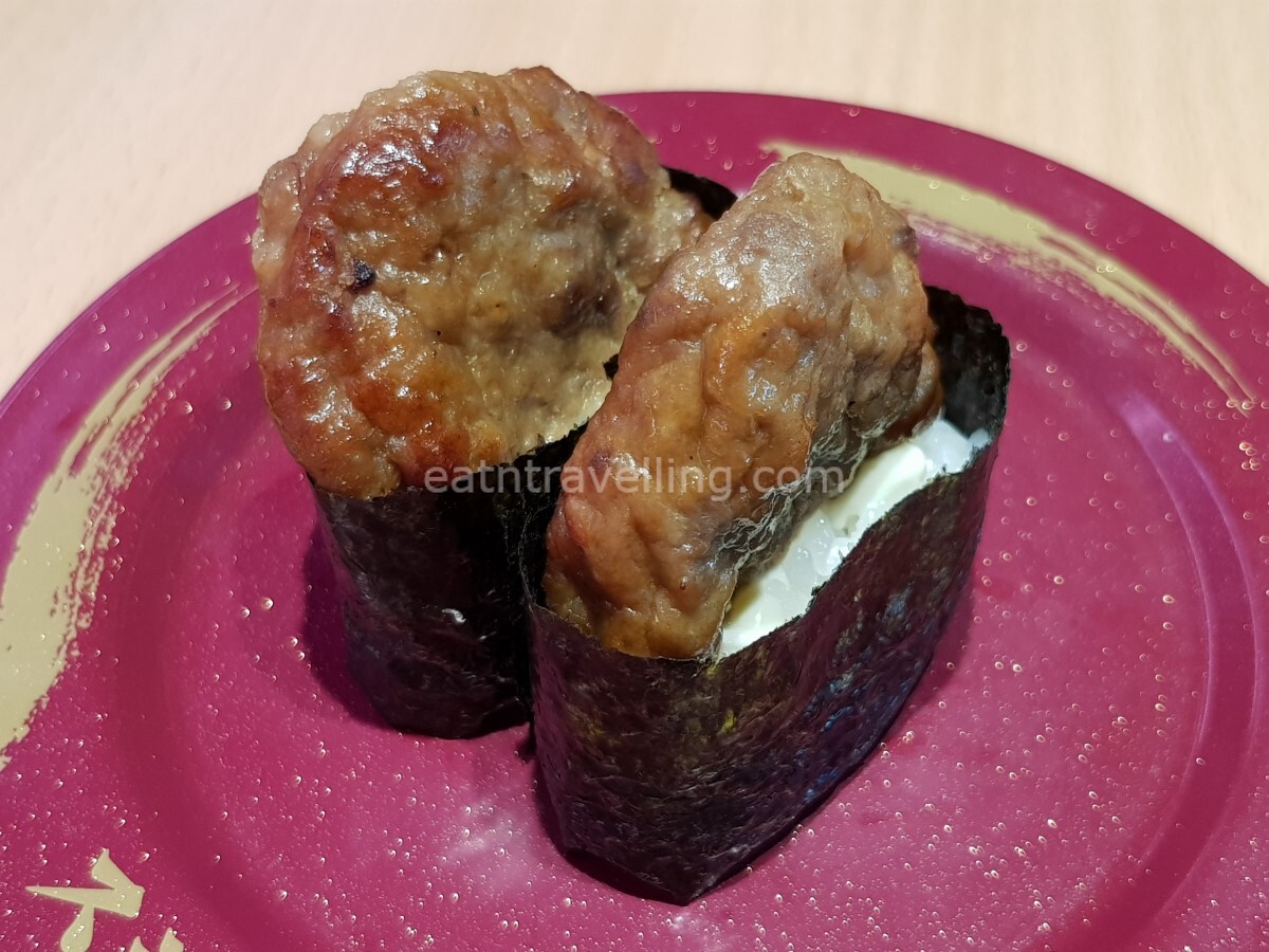 My nephew told me that he would order 4-5 plates of the Beef Meat Ball sushi. So I decided to try and taste for myself why he liked it so much. I tried a bite of the Beef Meat Ball and it was surprisingly good. Quite tasty and a nice beef texture. The Beef Meat Ball came with some mayonnaise on top of the sushi rice. I added more mayonnaise to it and popped the rest of the Beef Meat Ball sushi into my mouth. Great taste and texture when chewing. I could see why he liked it. I won’t mind having a hamburger made with the Beef Meat Ball.