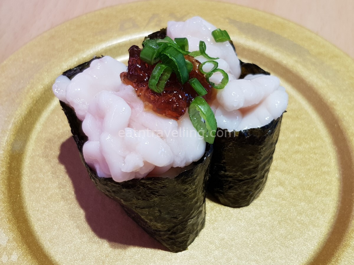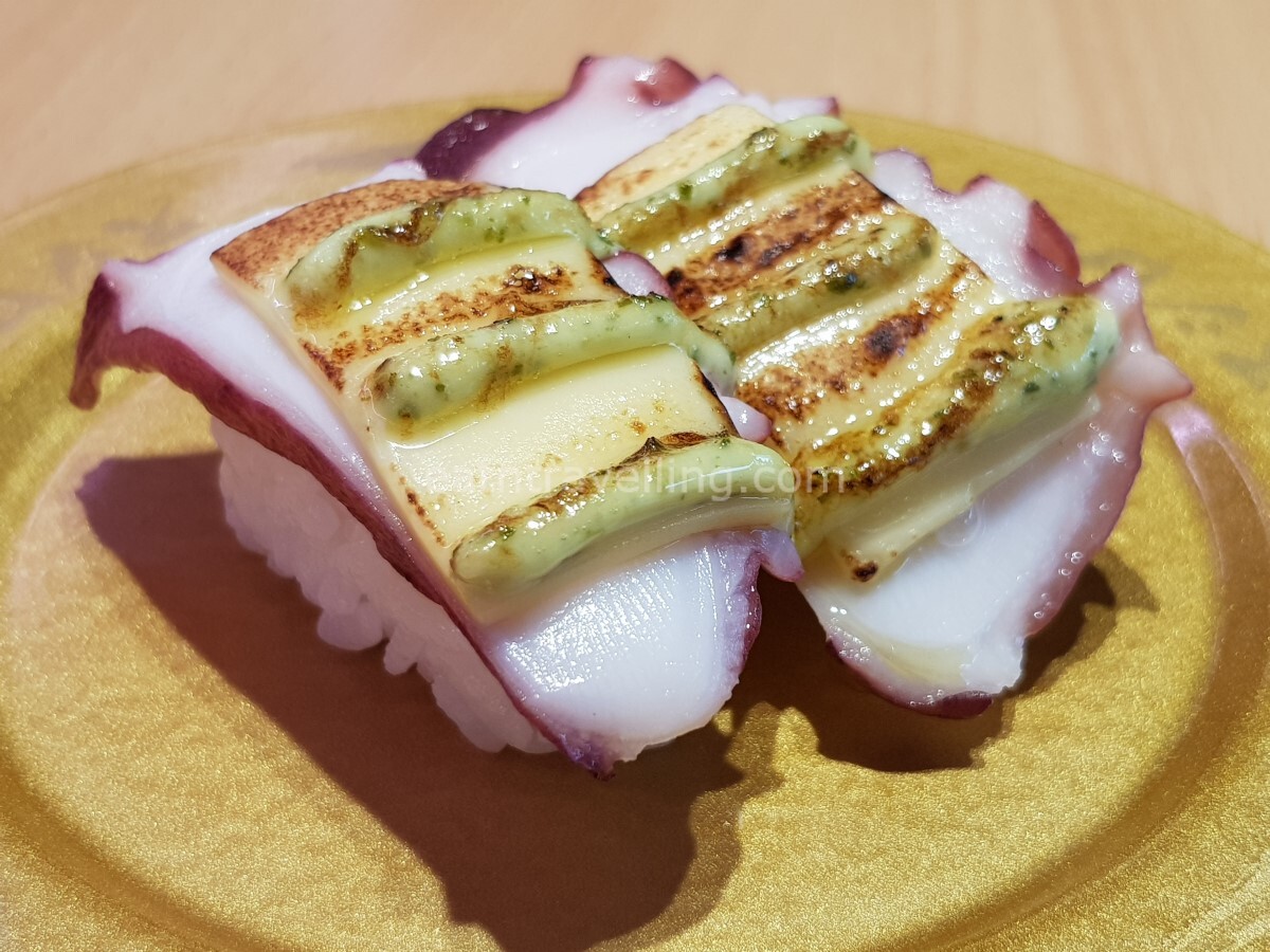 I like sweet shrimp so ordered the Sweet Shrimp Gunkan. The shrimps were sweet but they only place a small blob of mayonnaise on the gunkan. Again trying to split it between 2 gunkan meant there was really hardly any mayonnaise taste. Mum requested for Octopus and I found one with the nice Basil Cheese sauce I liked. Compared to the other sushi with Basil sauce, the Octopus with Basil Cheese wasn’t as nice. The Octopus was a little cold, if it was heated up a little more, it would have tasted better.
