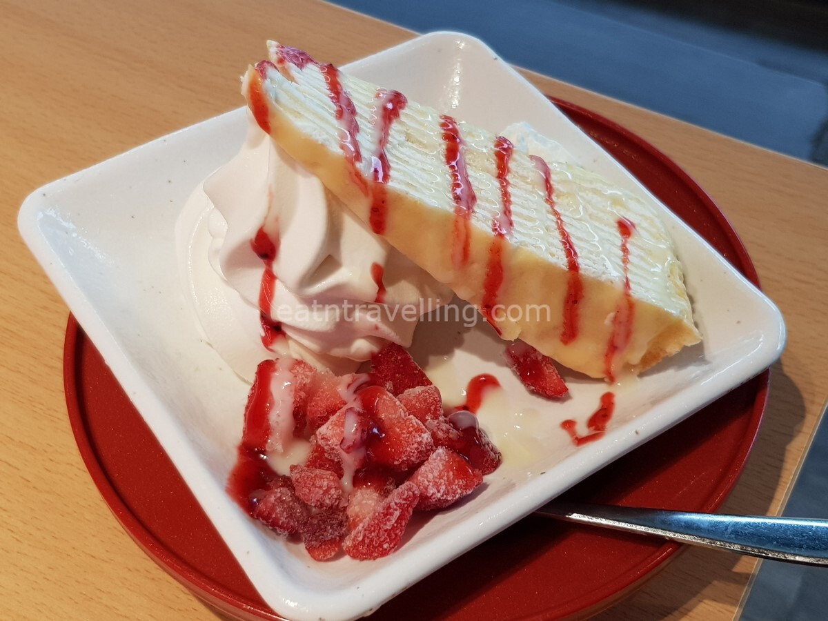 So I ordered 1 more – Mille Crepe Melba. A thin slice of Mille Crepe placed on top of Hokkaido soft serve ice cream; with a side of chopped up frozen strawberries and whipped cream; drizzled with strawberry sauce and condensed milk. The Millie Crepe was on the dry side as it split into smaller pieces when we tried to cut it with the spoon. The condensed milk made it very sweet. I liked the frozen strawberries and the strawberry sauce with the Hokkaido soft serve ice cream.
